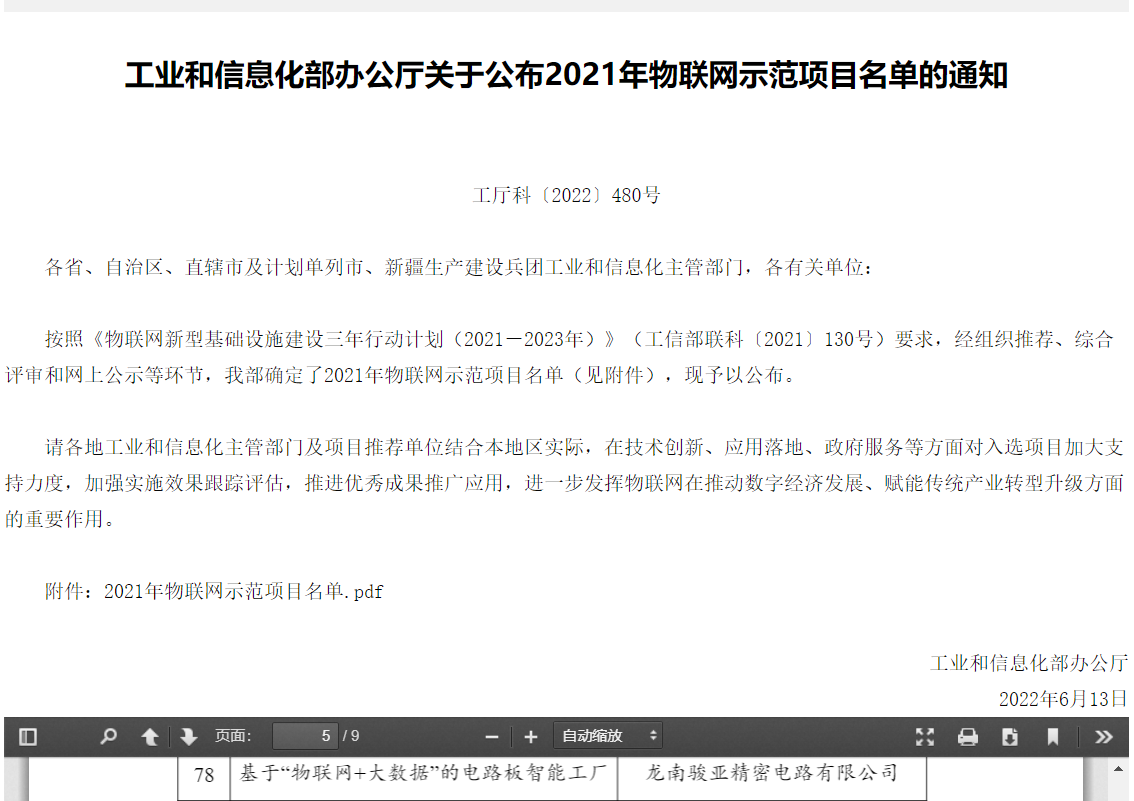 近日,国家工业和信息化部网站发布了“2021年物联网示范项目”公示名单,龙南9888拉斯维加斯精密电路有限公司“基于‘物联网+大数据’的电路板智能工厂”项目入选融合应用创新类项目。